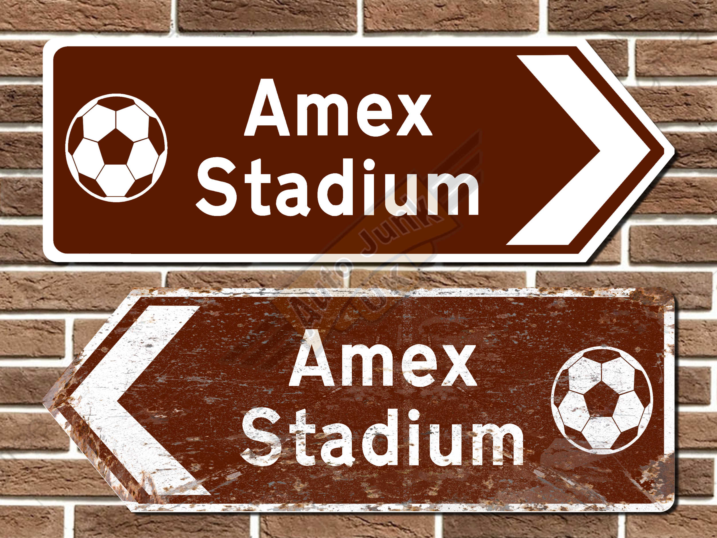 Amex Stadium metal road sign in the style of a traditional British road sign